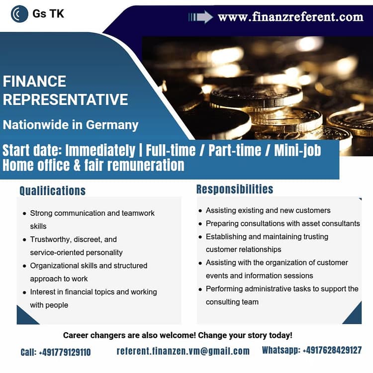 We are looking for motivated individuals to join our team as Finance Representatives across Germany. Whether you are seeking full-time, part-time, or mini-job opportunities, we offer flexible home office options and fair remuneration.