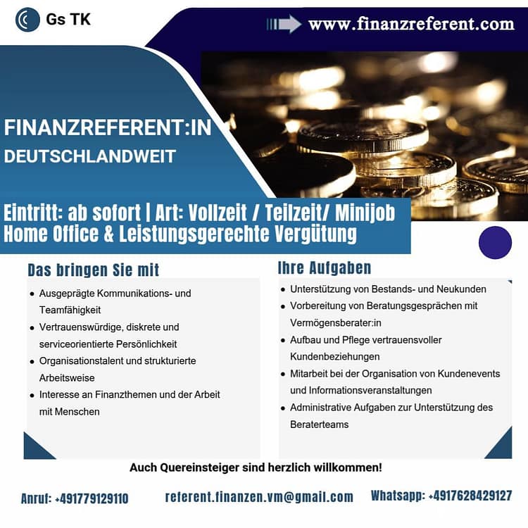 Wir suchen motivierte Personen, die unserem Team als Finanzberater in ganz Deutschland beitreten möchten. Egal ob Sie eine Vollzeit-, Teilzeit- oder Minijob-Stelle suchen – wir bieten flexible Home-Office-Möglichkeiten und eine faire Vergütung.
